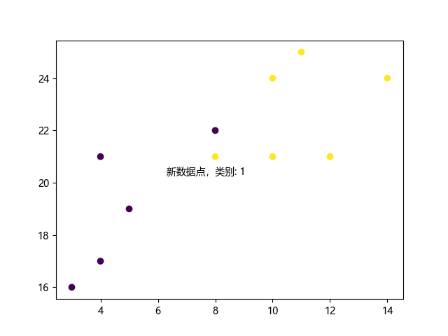 # 这三行代码使我们的编译器能够绘图: import sys import matplotlib matplotlib.use('Agg') import matplotlib.pyplot as plt from sklearn.neighbors import KNeighborsClassifier x = [4, 5, 10, 4, 3, 11, 14 , 8, 10, 12] y = [21, 19, 24, 17, 16, 25, 24, 22, 21, 21] classes = [0, 0, 1, 0, 0, 1, 1, 0, 1, 1] data = list(zip(x, y)) knn = KNeighborsClassifier(n_neighbors=5) knn.fit(data, classes) new_x = 8 new_y = 21 new_point = [(new_x, new_y)] prediction = knn.predict(new_point) plt.scatter(x + [new_x], y + [new_y], c=classes + [prediction[0]]) plt.text(x=new_x-1.7, y=new_y-0.7, s=f"新数据点,类别: {prediction[0]}") plt.show() # 这两行代码使我们的编译器能够绘图: plt.savefig(sys.stdout.buffer) sys.stdout.flush()