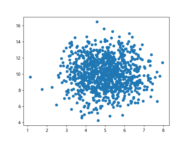 # 三行配置使编译器支持绘图功能: import sys import matplotlib matplotlib.use('Agg') import numpy import matplotlib.pyplot as plt # 生成正态分布数据:x~N(5.0,1.0),y~N(10.0,2.0),各 1000 个样本点: x = numpy.random.normal(5.0, 1.0, 1000) y = numpy.random.normal(10.0, 2.0, 1000) # 绘制散点图 plt.scatter(x, y) plt.show() # 两行代码实现图形输出: plt.savefig(sys.stdout.buffer) sys.stdout.flush()